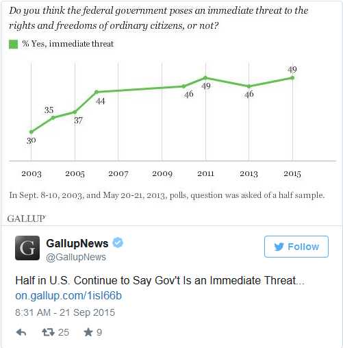 Poll: Nearly half of Americans see government as 'immediate threat' to freedom :: 09/23/2015