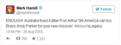 Hamill, also known as Jedi Luke Skywalker, took to Twitter this week in support of the father of slain reporter Alison Parker, who vowed to take on the National Rifle Association and push for stricter gun laws