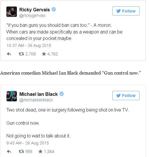 Hamill wasn’t the only celebrity to voice their opinions on the tragic killing of the journalists. British comedian Ricky Gervais chastised those who would defend guns following such a killing.