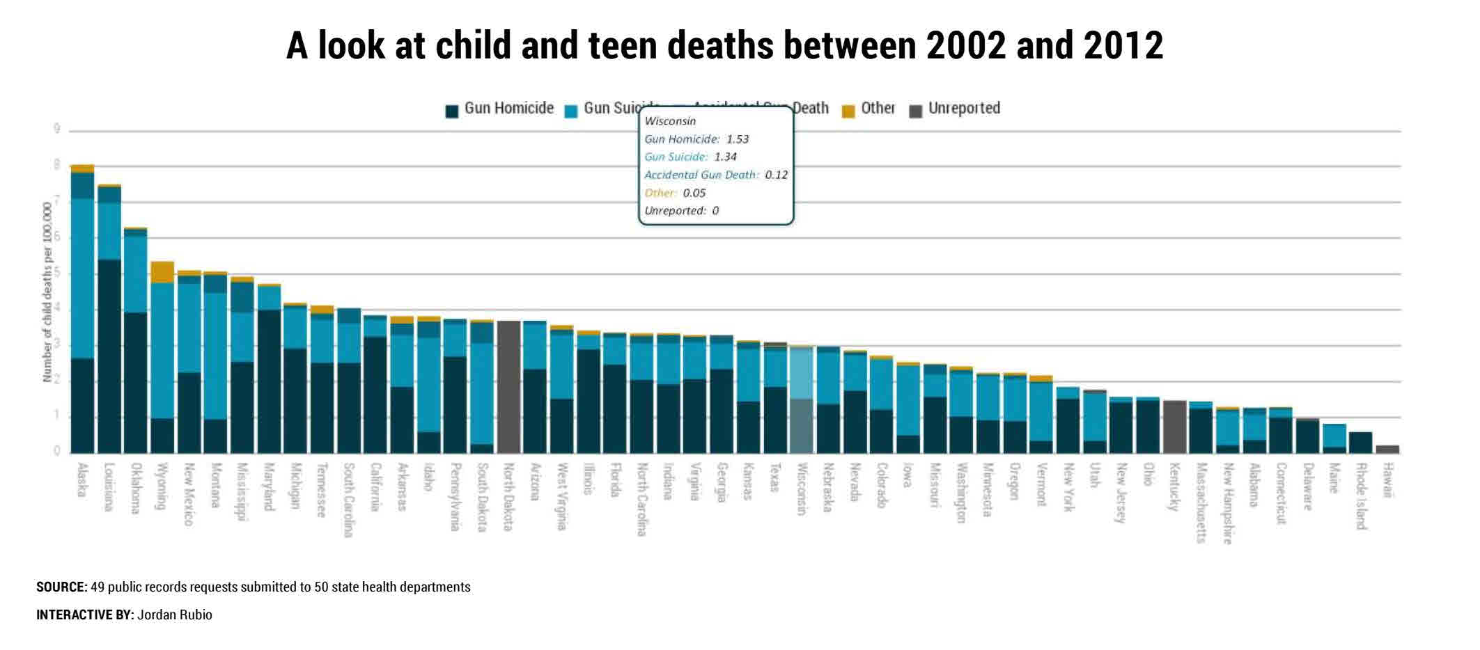 A News21 investigation of child and youth deaths in America between 2002 and 2012 found that at least 28,000 children and teens 19-years-old and younger were killed with guns. Teenagers between the ages of 15 and 19 made up over two-thirds of all youth gun deaths in America.